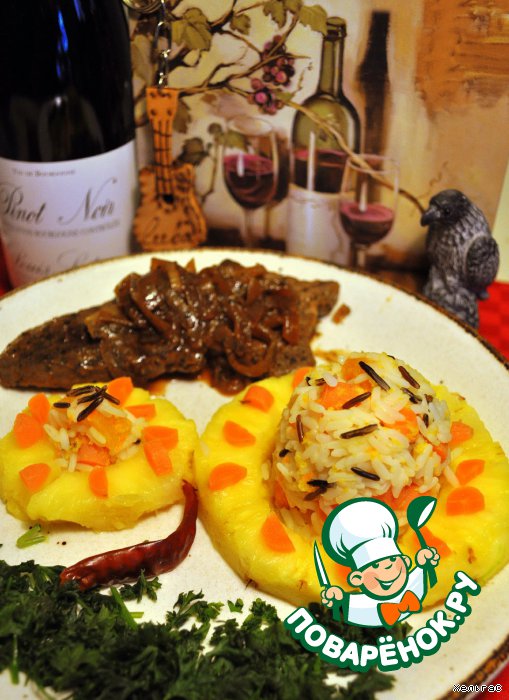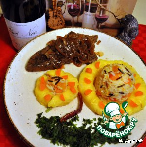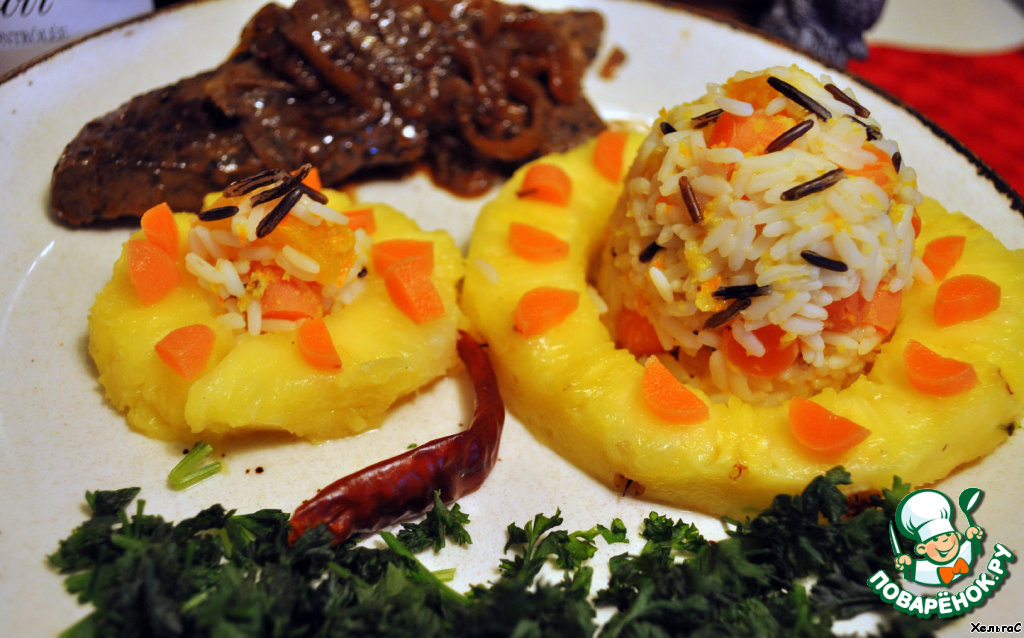 Сервируем в круг ананаса рисовую смесь и подаем вместе с мясом, если надо... а можно и без... мяса.