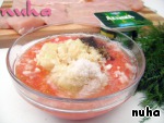 Помидоры очистить от кожицы, натереть на тёрке или пюрировать с помощью блендера. Добавить в томатное пюре измельчённый лук, выдавленный через пресс чеснок, соль, перец.