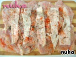 После того, как филе промариновалось, выложим его в форме двух одинаковых прямоугольников. Сало порежем тонкими полосками, выложим на наше мясо. Посыпем специями: перцем, паприкой, мускатным орехом и кумином. Специи обязательно и желательно именно такие!