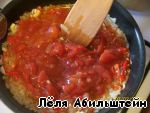 Я порубила их лопаткой прямо в сковороде, т.к. помидорки очень мягкие. Чуть-чуть потушите, минутки 3.