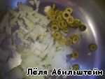 В кастрюлю, где будет вариться суп, мелко нарезать одну луковку. Оливки нарезать кусочками и добавить к луку.