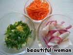 Корейская морковь домашнего приготовления. Замороженное сало, нарезанное почти прозрачными кусочками, смешать с маринованным луком и присыпать черным перцем. Салат из отварных яиц и зелёного лука, хорошо приправленных солью и сметаной.