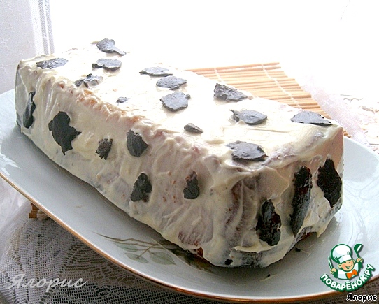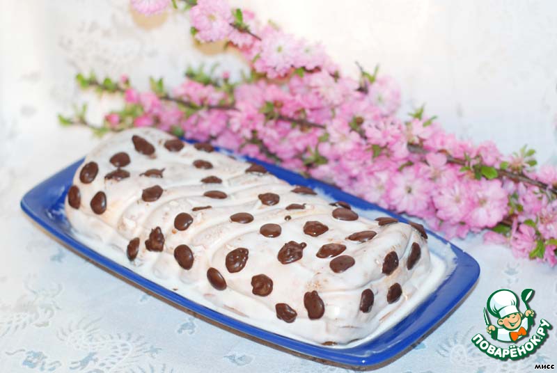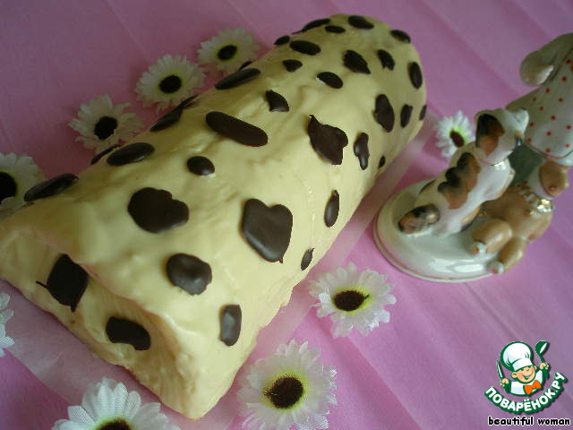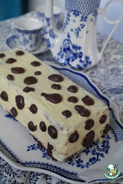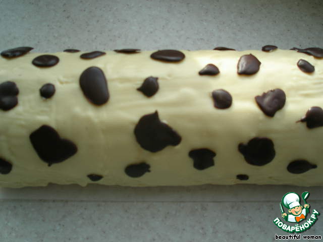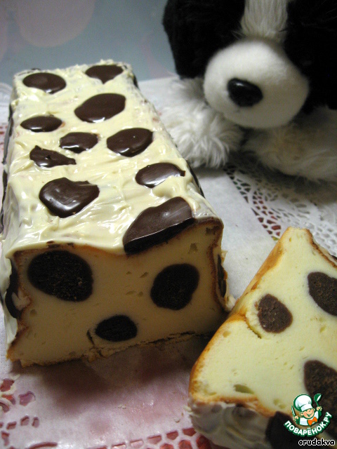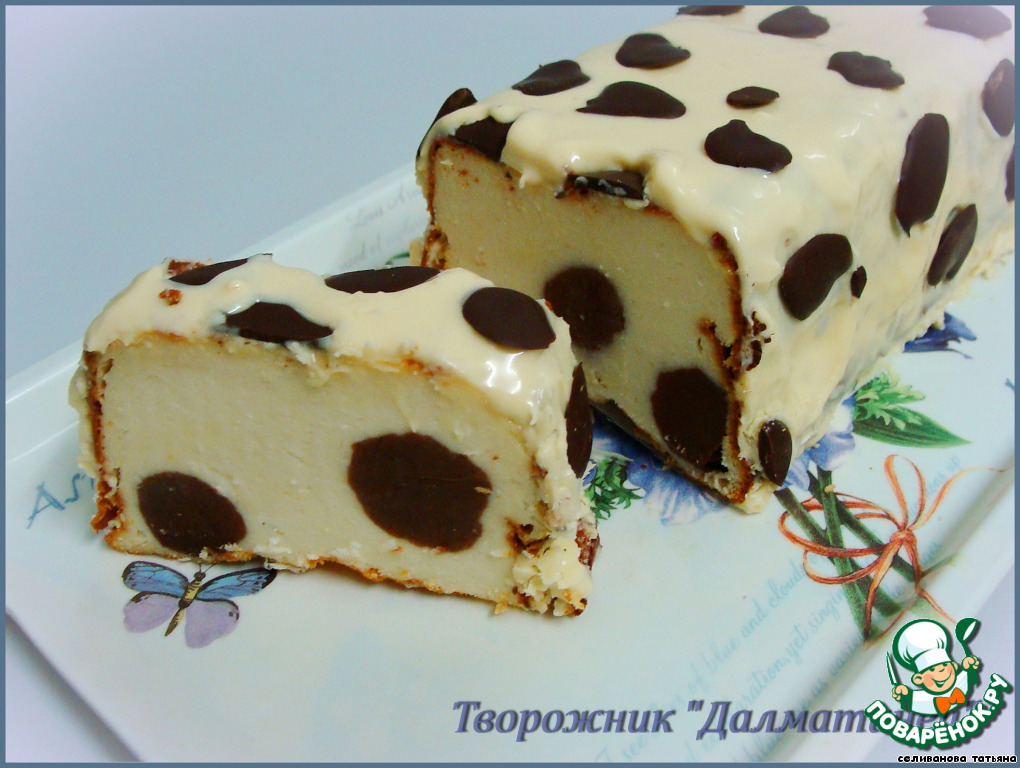 Далее перекладываем творожник на чистый лист пергамента и хаотично раскладываем при помощи лезвия ножа сегменты темного шоколада по всей поверхности, что в итоге напоминает окрас далматинца. Охлаждаем.