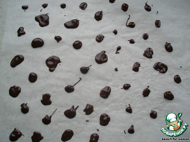 Растопим темный шоколад в микро и нанесём на пергамент при помощи чайной ложки капли различной формы. Оставим в морозильной камере до нужного момента.