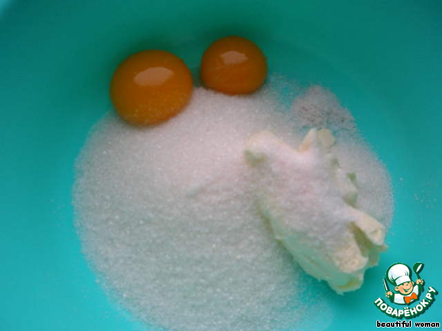 Яйца разделить на белки и желтки. Желтки растереть с сахаром, сливочным маслом, солью и ванильным сахаром добела.