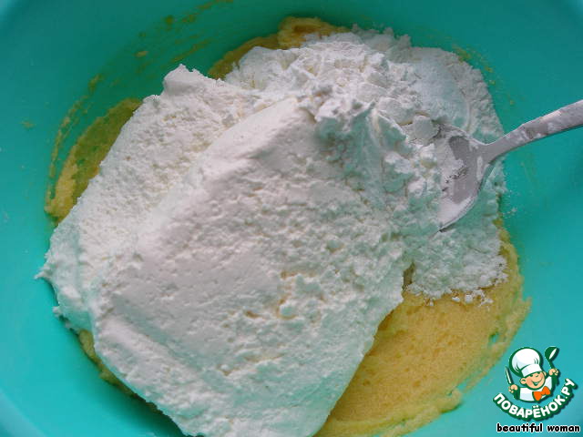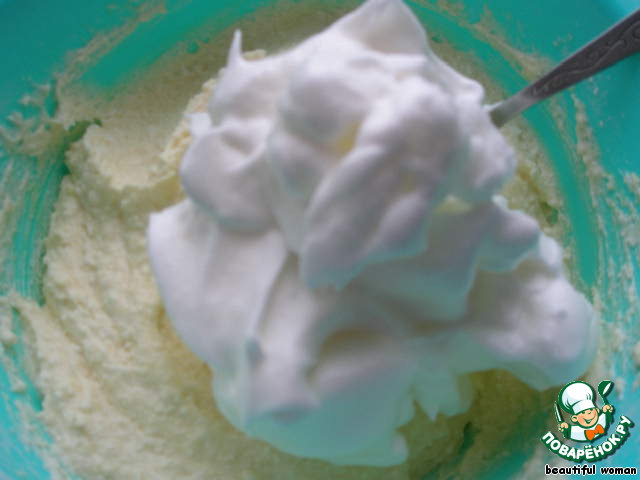 К творожной массе добавим взбитые белки и аккуратно смешаем движением снизу вверх.