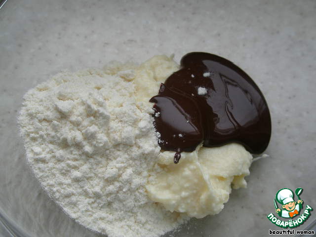 Возьмем 1 ст. ложку творожной массы и добавим к ней 1 ст. ложку муки и 1 ст. ложку растопленного темного шоколада. Перемешаем до однородности.