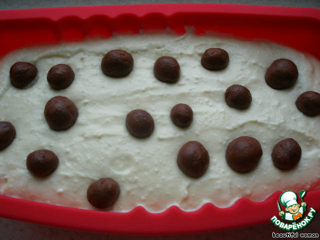 Выкладываем творожную массу в форму на бумагу для выпечки. Я пекла в силиконовой, поэтому ничем её не смазывала и не перекладывала. Сверху на массу раскладываем шоколадные шарики.