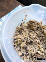 Затем смешать рис с сыром, мукой, яйцами, тёртой цедрой лимона, розмарином. Посолить по вкусу.