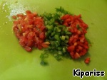 Болгарский перец и помидоры нарезать мелкими кубиками. (Мне показалось, что как-то маловато в рецепте овощей. Я положила чуть больше - примерно 20 г перца и 30 г помидоров).