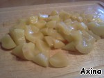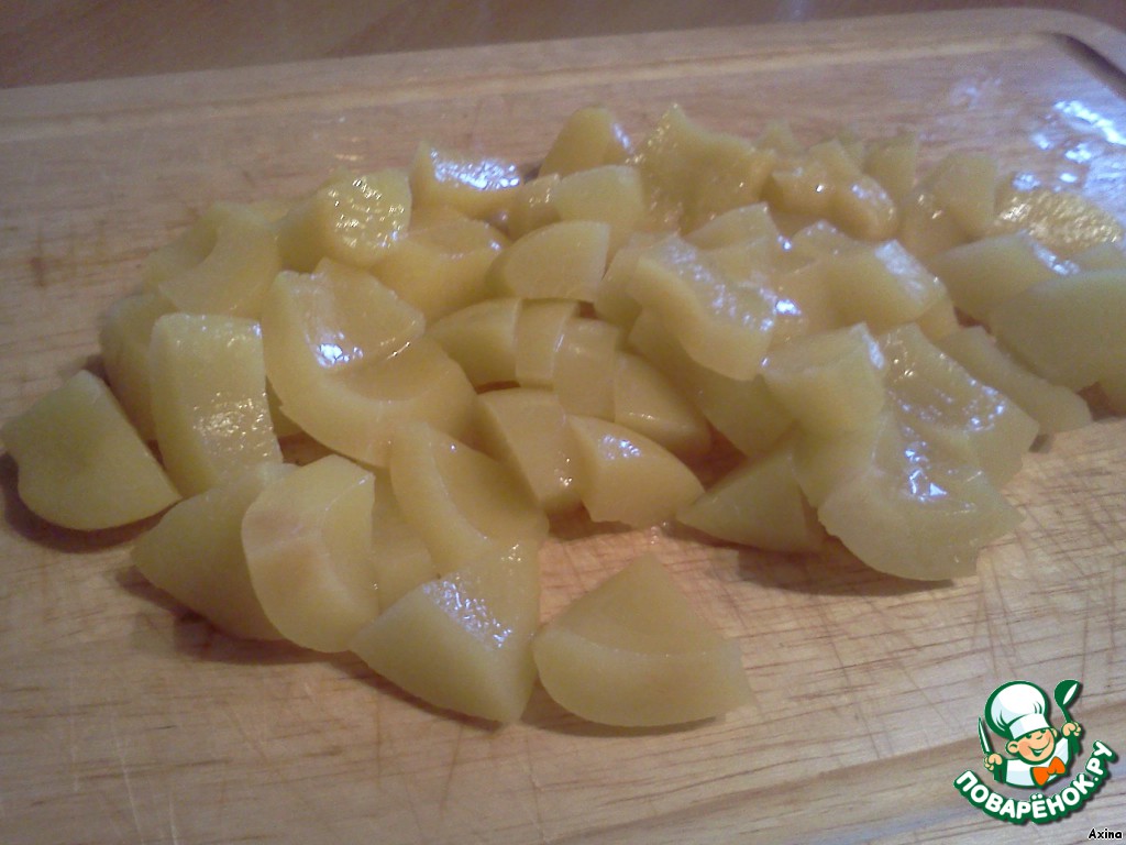 Сливаем с персиков сироп и нарезаем на небольшие кусочки,