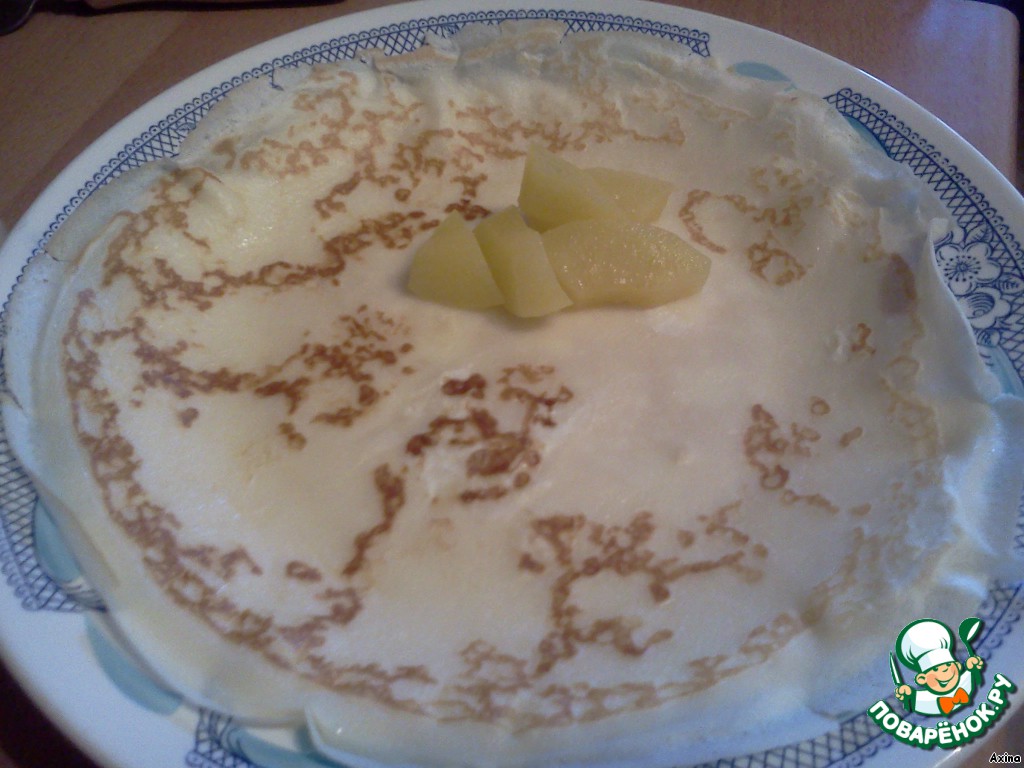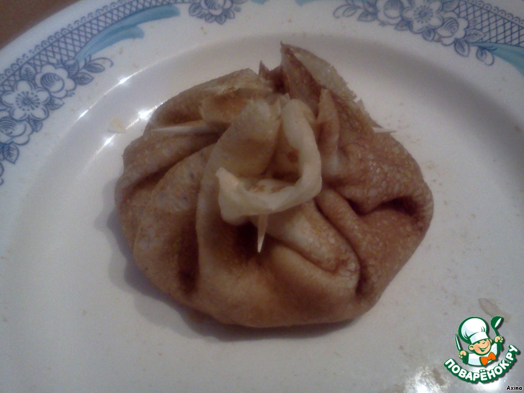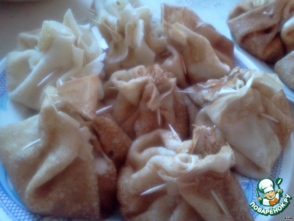 Мешочки из нежирных тонких блинчиков с начинкой из консервированного персика и мороженого. Интересное сочетание вкусов. Понравятся как детям, так и взрослым!