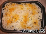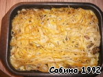 В форму выложить слой макарон, затем слой соуса, посыпать тёртым сыром. Затем повторить. Закончить макаронами.