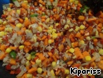 Далее добавляем морковь, зерна кукурузы и сладкий перец. Потушим под крышкой 4 минуты.