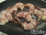 Разогреваем сковороду и обжариваем наших завернутых креветок на растительном масле до золотистого оттенка. Как только креветки поджарились с одной стороны, зубочистки можно извлечь.
