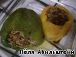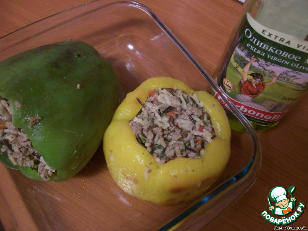 Начинить очищенные перцы фаршем. Немного полить оливковым маслом.