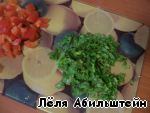 Красный болгарский перец нарезать маленькими кубиками. Кинзу мелко порубить.