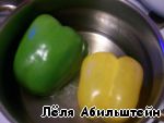 Положить в масло целые болгарские перцы (зеленый и желтый), очищенные от семян и плодоножки. У меня были мясистые перцы. Если у Вас перцы тонкостенные, их нужно обжарить целыми, а очистить потом. Обжарить со всех сторон до легкого подрумянивания.