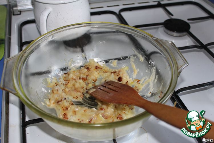 • Обжарить лук в оливковом масле на сковороде. В кастрюлю налить масло и добавить муку, помешивать до золотистого цвета. Добавить обжаренный лук. Перемешать.