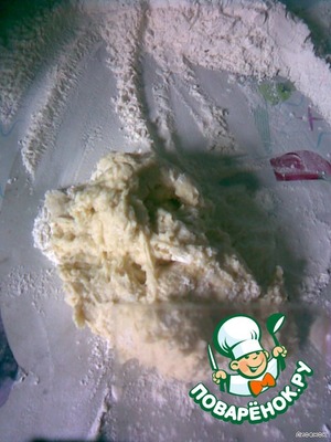 Ложкой берем часть теста и кладем на стол, посыпанный мукой.
