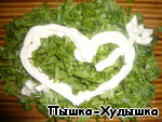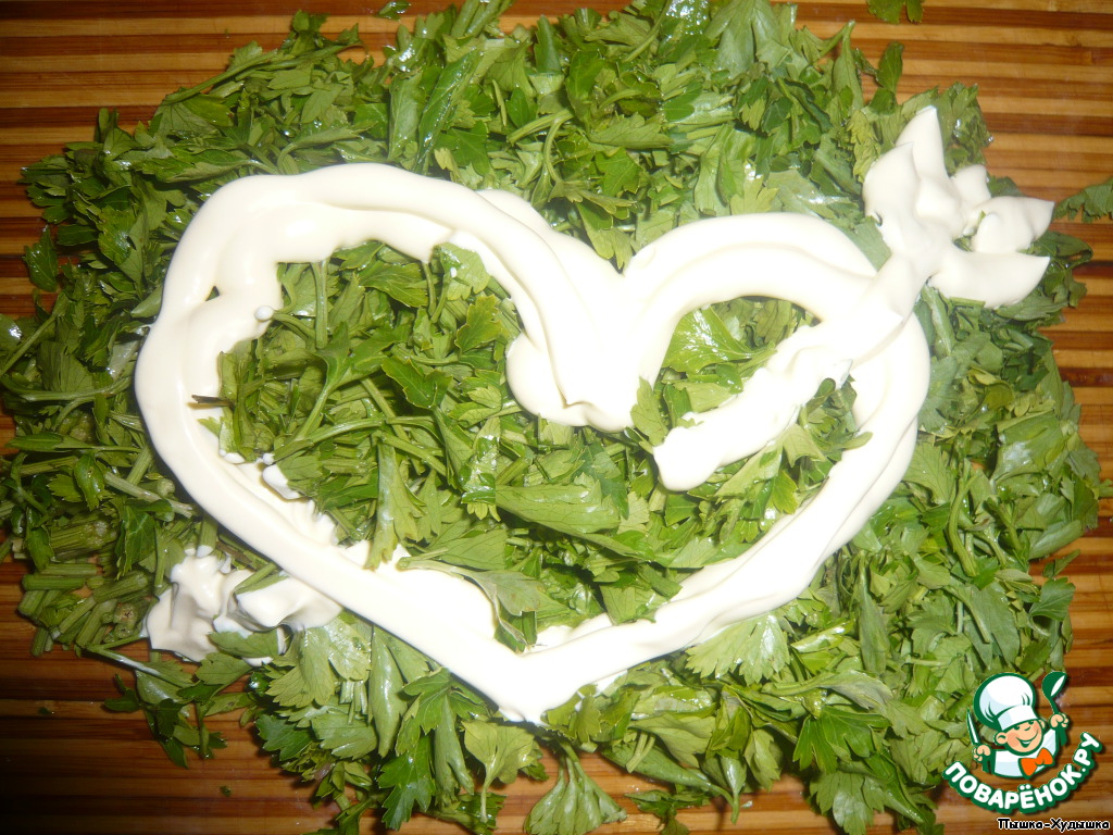 Петрушку режем произвольно. Смешиваем с майонезом.