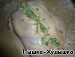 На него кладем курочку в развернутом виде, мясо солим, перчим, кожицу сшиваем стебельками петрушки (раньше я ее зашивала или скрепляла зубочистками, но пришла идея!!! сделать шовчики из стебельков), держит очень хорошо.