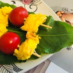 Готовый омлет режем на кубики. Затем нанизываем на шпажки, чередуя с томатами черри
