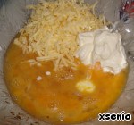 Яйца аккуратно размешиваем вилкой (не взбивая) с солью и перцем. Добавим сметану и тертый сыр