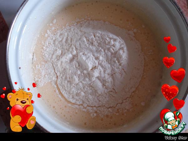 Добавить соду, соль, ванилин, муку (смотрите по консистенции, что бы тесто было, как густая сметана)
