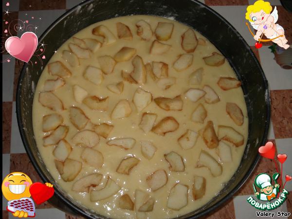 В форму смазанную маслом и присыпанную мукой выкладываем тесто. Внимание!!! Яблоки укладываем СВЕРХУ теста!!!