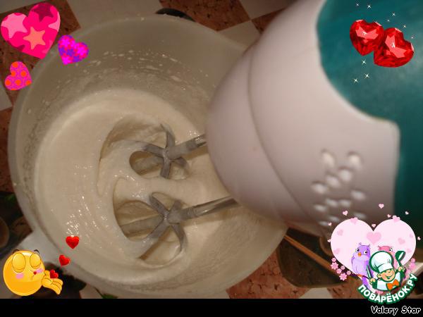 Пока тесто поднимается в духовом шкафу, готовим "гоголь-моголь", взбиваем белки с сахаром в очень крепкую пену.