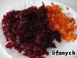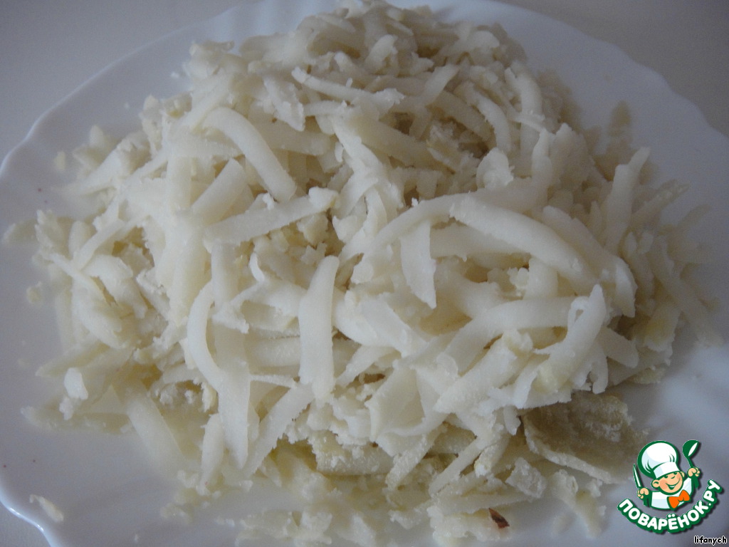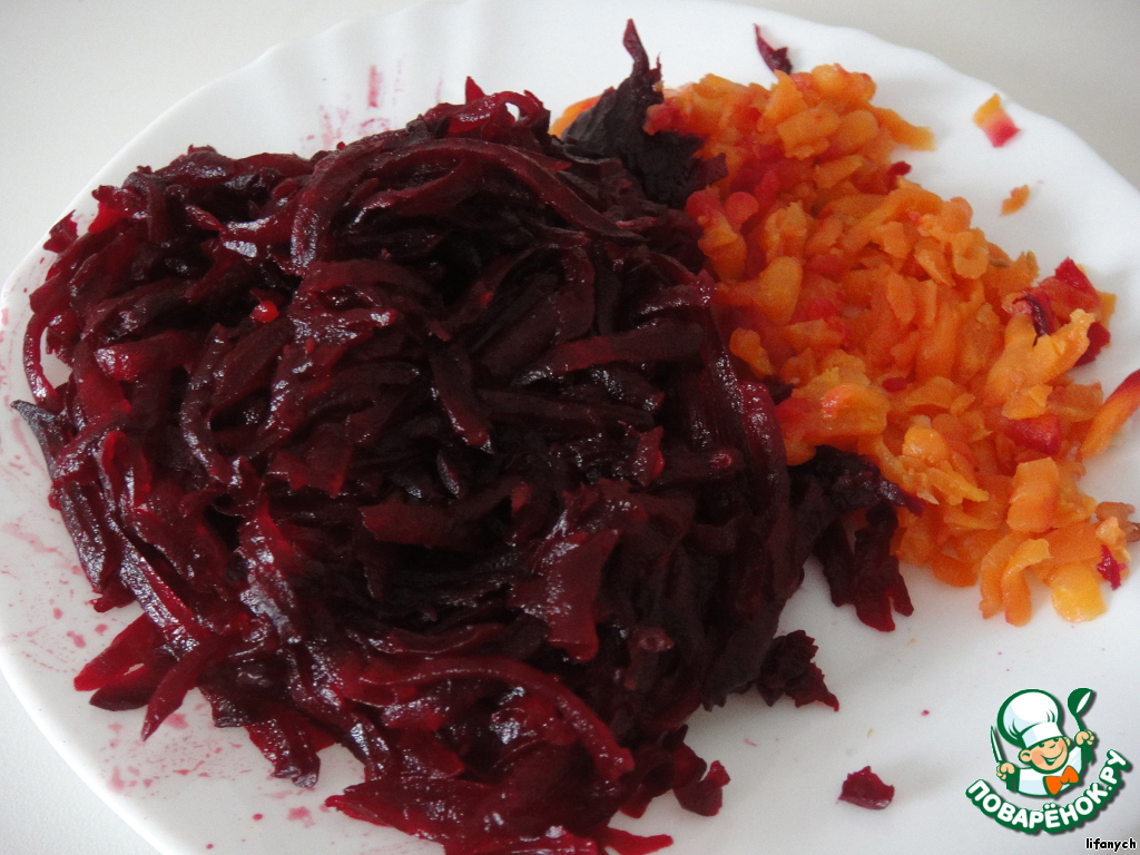 Для начала отвариваем овощи и делаем заготовку на крупной тёрке. Сначала картошку