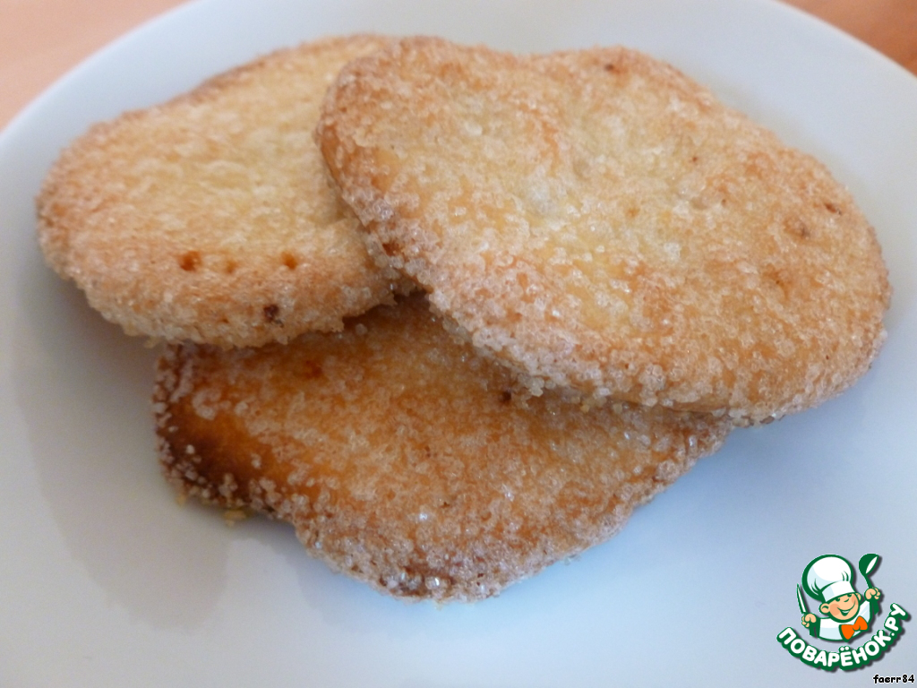 Насыпать на тарелку горку сахара. Лепешку положить на сахарную горку и облепить ее сахаром, сначала с одной стороны, потом перевернуть на другую. Толщина 2мм (можно тесто не катать, а просто сделать шарики и руками их вдавливать в горку с сахаром)