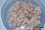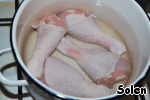 Окорочок почистить, сварить (у меня в этот раз были ножки). Понятно, что жирность и крепость бульона можно регулировать, можно снять кожу, можно взять грудки - тут действуйте по Вашему вкусу. Для меня по опыту самым лучшем вариантом оказался окорочок :). Бульона в итоге должно получиться примерно 1,5 литра. Курицу вынимаем из бульона.