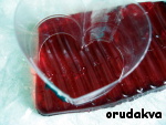 Желе уже застыло. Ставим емкость с желе донышком в горячую воду, затем переворачиваем на стол, застеленный пищевой пленкой или пергаментом.