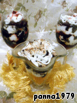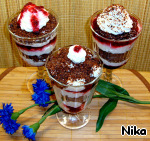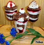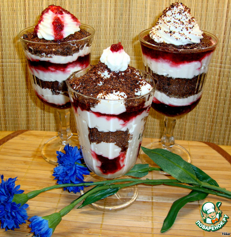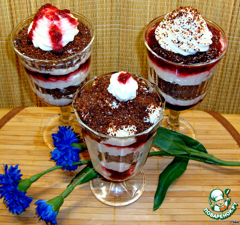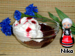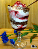 На фото видно слои - варенье, сливки, хлеб... Верхний слой сливок обсыпала хлебной крошкой. Из кондитерского мешочка выдавила сливки. Их сверху полила сиропом из варенья и посыпала крошкой.
