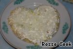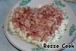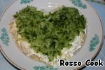 Картофель натереть на крупной терке. Выложить первым слоем, сразу же формируя сердце. Каждый слой по желанию присолить и смазать майонезом.