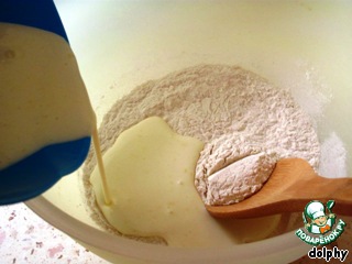 Вылейте йогуртовую смесь на сухую, перемешайте деревянной ложкой. Если тесто получится слишком густым, добавьте немного молока. Тесто должно свободно стекать с ложки.