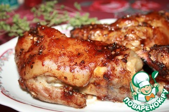 Заворачиваем рулет в пергамент. Во внутрь пергамента вылить маринад. Я для надежности положила рулет в форму, чтобы не вытек сок.