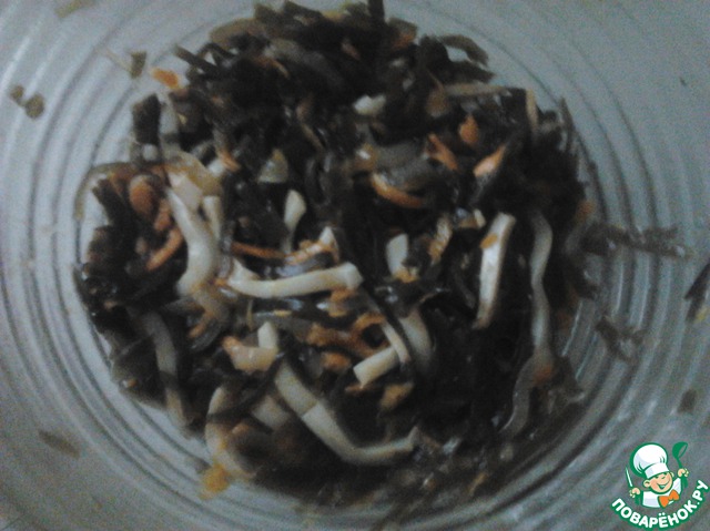 • Для начала отвариваем кальмары (2 минуты), чистим, режем тонкой соломкой. Морскую капусту выкладываем из банки, если у вас сухая, то можно и из нее, но я ни разу не пробовала.