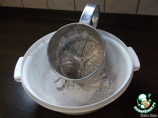 Крахмал, какао, разрыхлитель смешиваем и просеиваем через сито...