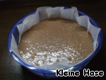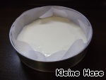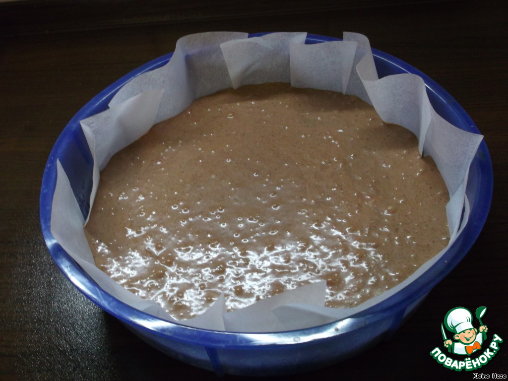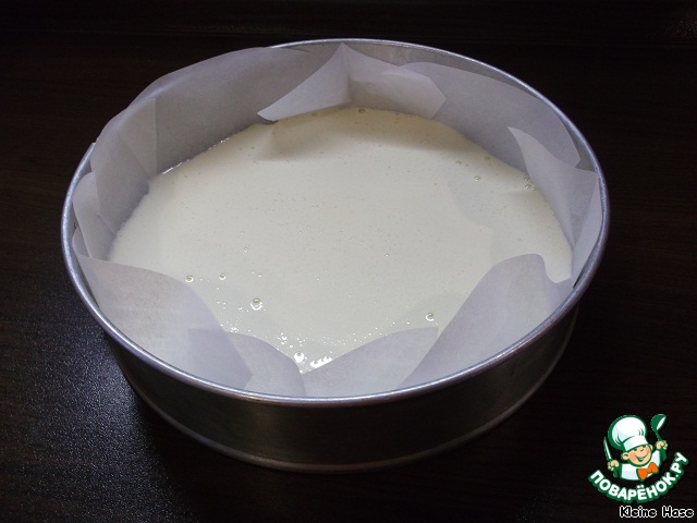 Выливаем массу в застеленную бумагой для выпечки форму - диаметр 26 см.