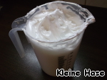 В белки добавляем 4 ст.л. холодной воды и взбиваем. Вводим сахар и продолжаем взбивать ещё 2 минуты.