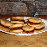 Черносмородиновое варенье слегка подогреваем, половину печенюшек смазываем вареньем и приклеиваем вторые половинки.