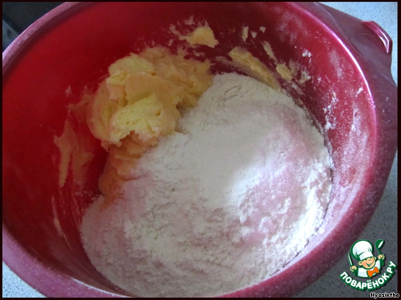 Добавляем муку, быстро замешиваем тесто (лучше это делать холодными руками).