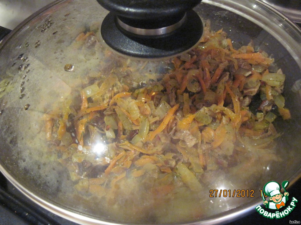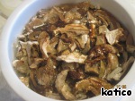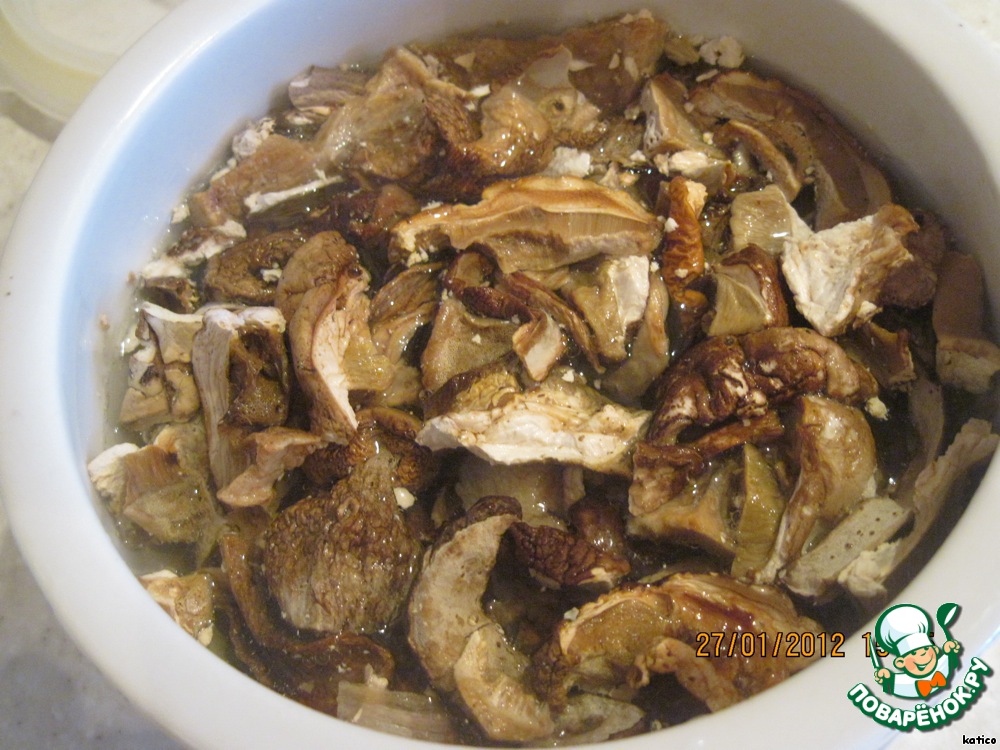 • Для начала сушеные грибы залить кипятком (чтоб только были покрыты водой) и оставить для разбухания. Если будете использовать свежие грибы, этот шаг пропускаем