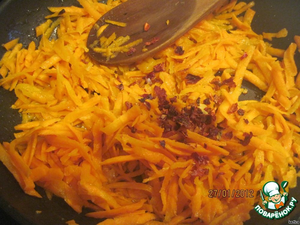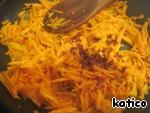 • Разогреть небольшое количество растительного масла, чеснок измельчить, морковь натереть, слегка обжарить, добавить нарезанный лук, перемешать