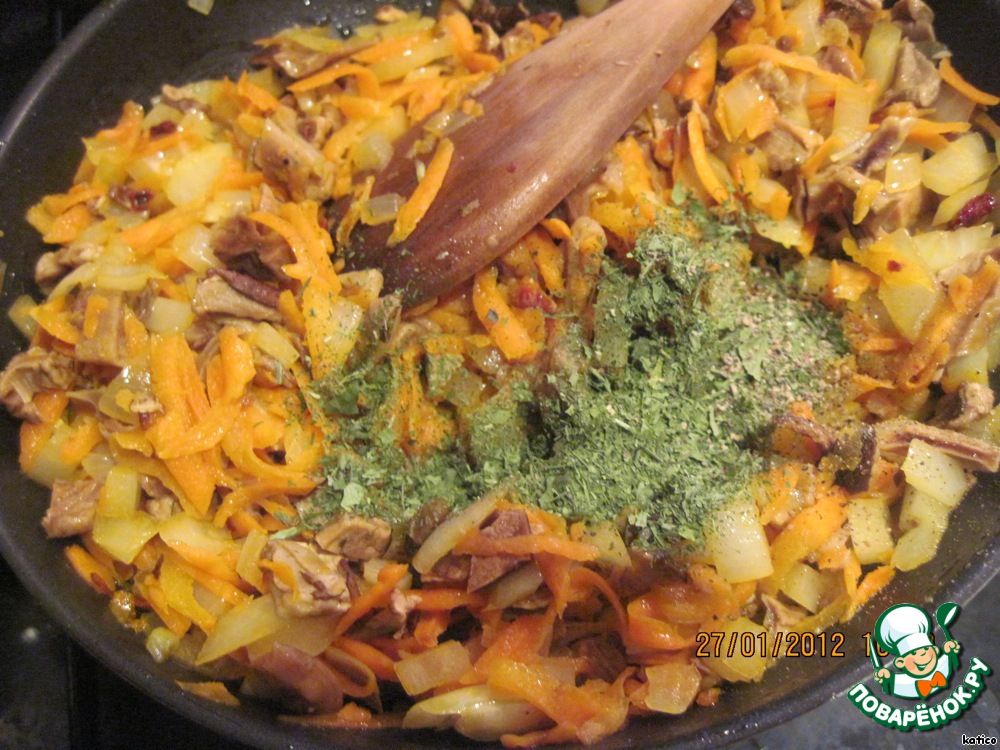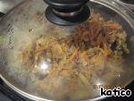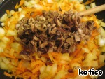 • К овощам добавить измельченные, предварительно замоченные, сушеные грибы