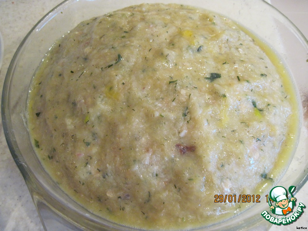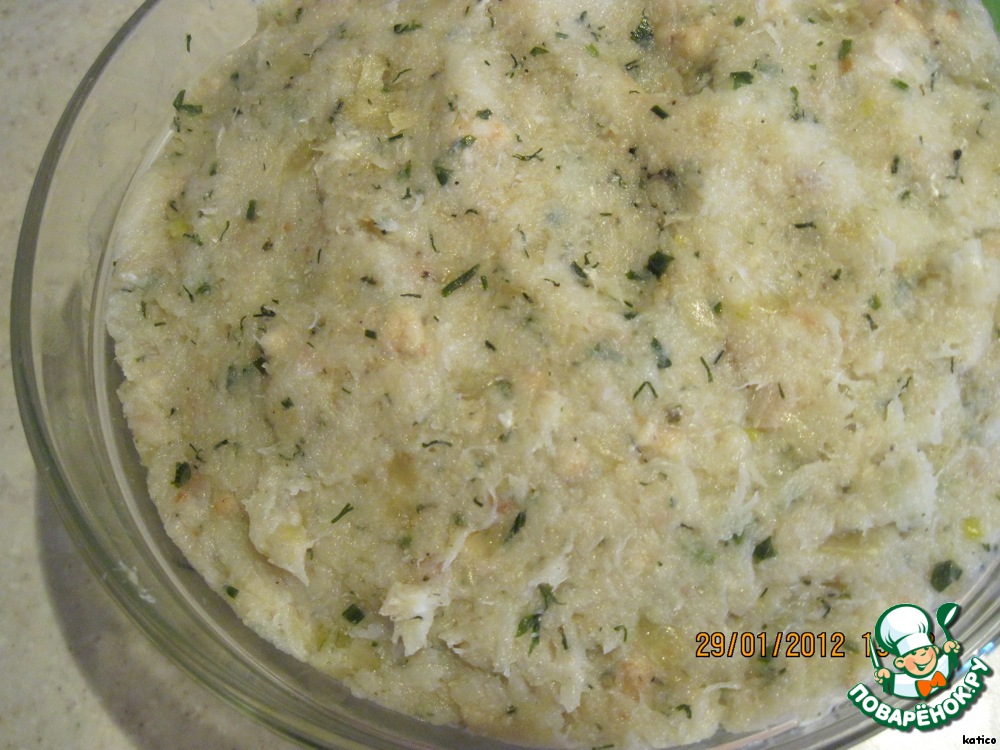 • Рыбное филе разделить на 2 части, из одной части готовим рыбный фарш: пропустим рыбу через мясорубку, добавим яйцо, замоченную в сливках/молоке булку, специи, соль, сухую зелень и 1 ст. л. оливкового/раститель ного масла, хорошенько вымешать до однородности
