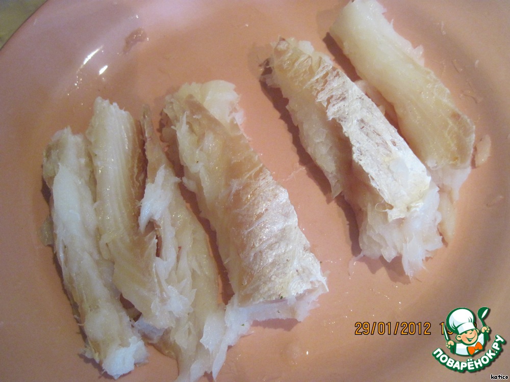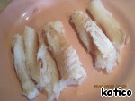 • Вторую часть рыбного филе режем на длинные брусочки, примерно размером с палец